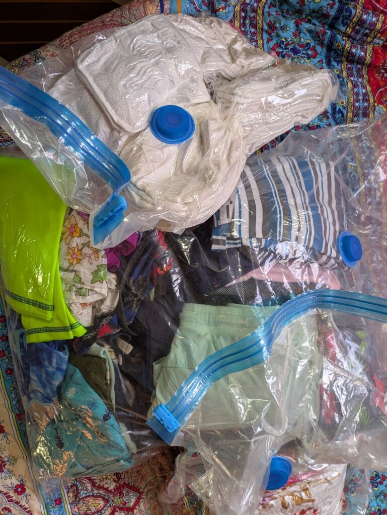 This year, I purchased a lot of vacuum-sealed bags and went all out. Every piece of clothing that was left behind, and anything made of fabric, went in. I put bigger items in big garbage bags. The only thing that I ran out of time to do was to wrap all my cushions. Fabric attracts moisture, which then becomes a breeding ground for mold. Even books can have mold growing on them, which I had the unfortunate chance of cleaning after leaving our boat for the first time in tropical Florida. From then on, I’ve been putting my books, puzzles, and wooden toys all in bags. It takes much less time unbagging everything once you return, instead of doing a full load of Barbies’ and dolls’ clothes.