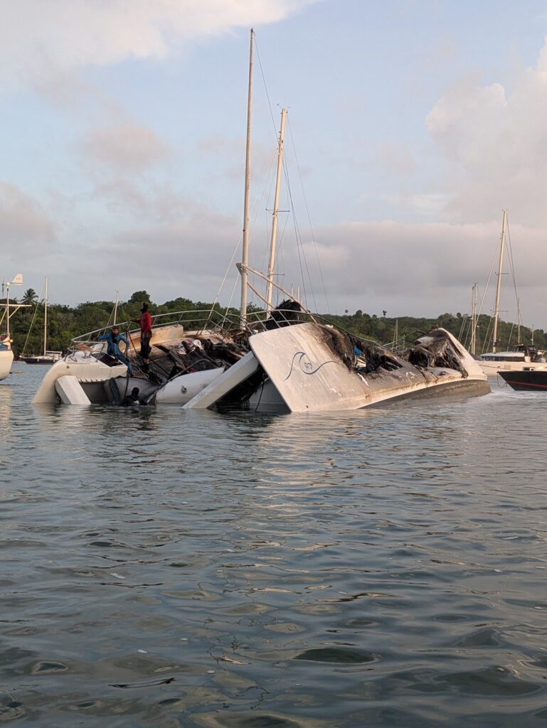 By daybreak, the flames had subsided and it finally seemed under control. I still couldn’t go to sleep as both kids were now wide awake watching the big cloud of white smoke with me. Throughout the day I could smell the burnt smell of plastic, fiberglass and chemicals every time the wind switched over to our direction. At least it wasn’t too often. Just a few days later they already had the catamaran lifted on bags. It was being towed between the tight spider web of boats over to the marina to get hauled out.