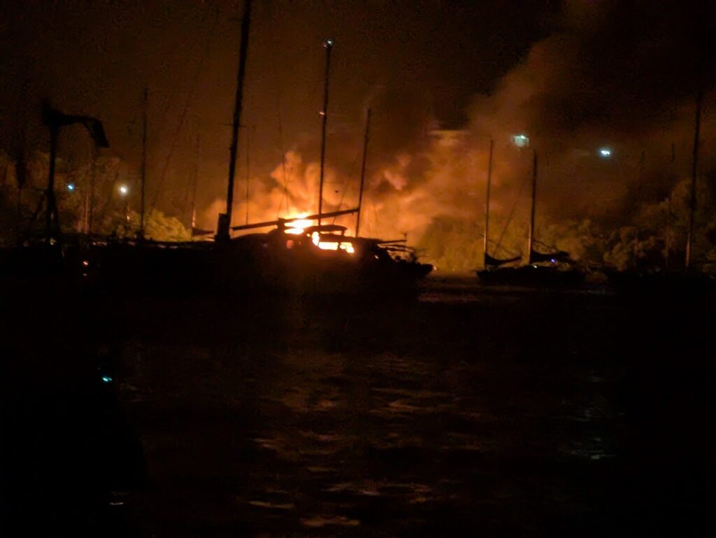 For the following hours I stayed up keeping an eye on it, ready to make a quick move. Some closer boats even went to anchor further away worried for their safety. There was nothing to do to stop the fire as it was just out of control. The only option for the local firefighters was to try to make it sink as fast as possible, spraying it with all they had. Even neighbouring towns sent help.